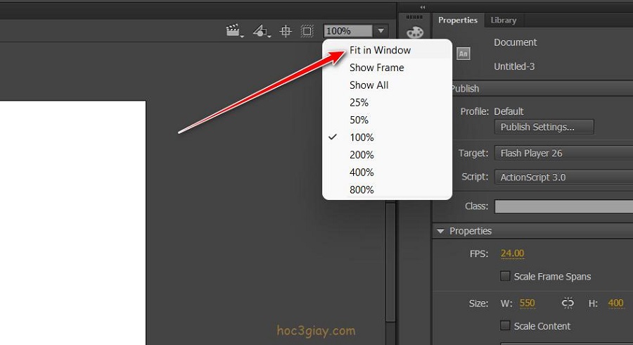 Bước 2: Chọn chế độ hiển thị 100%, sau đó chọn Fit in Window như ảnh dưới