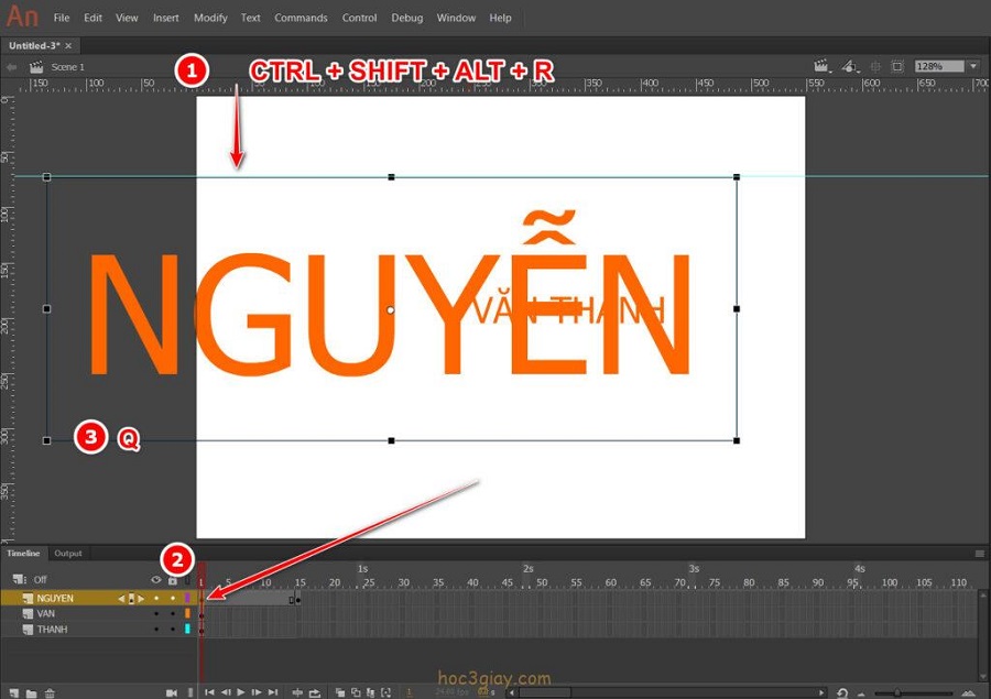 Khi đánh dấu xong bằng thước, bạn chọn keyframe đầu tiên ở layer Nguyễn. Và chọn phím tắt Q để phóng to chữ Nguyễn lên bằng với điểm đã đánh dấu ở số 1.