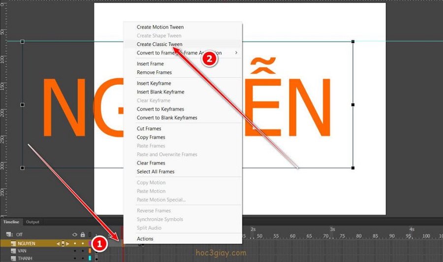 Bước 10: Click chuột phải vào phần thân của frame được tạo ra bên trên layer Nguyễn. Bạn cần chọn chức năng Create Classic Tween khi một danh sách hiện ra.