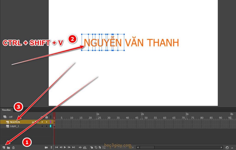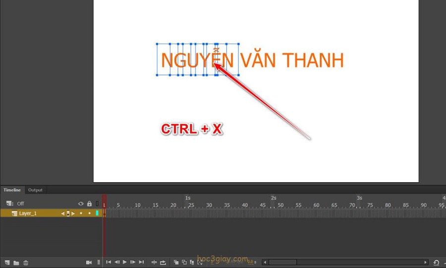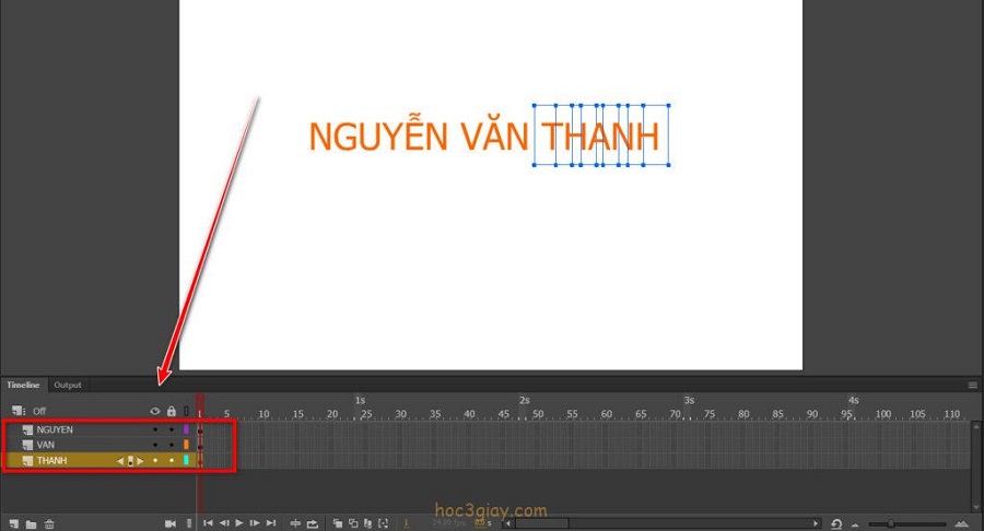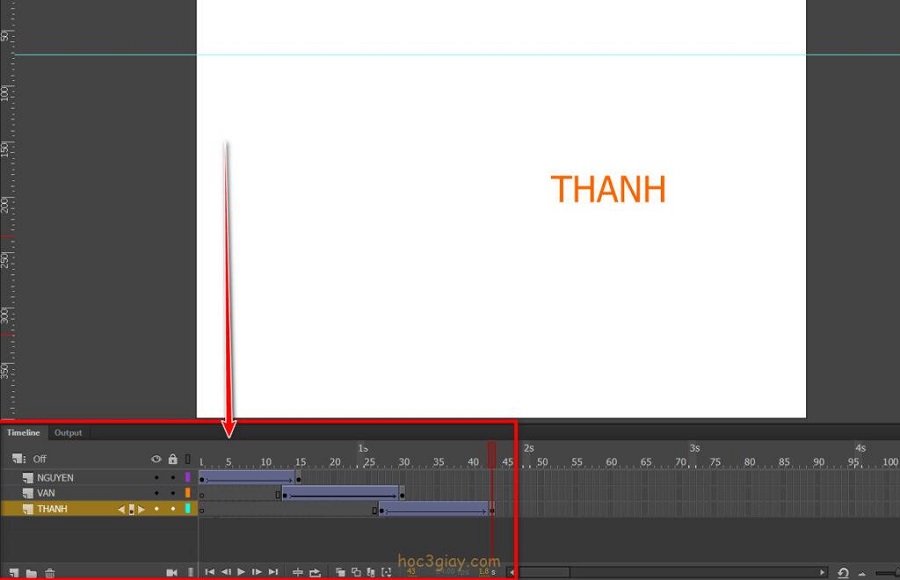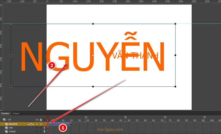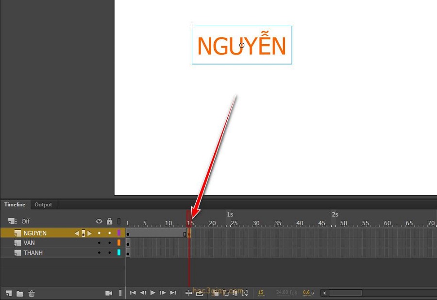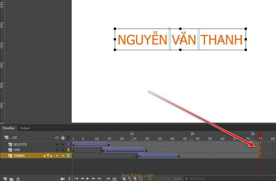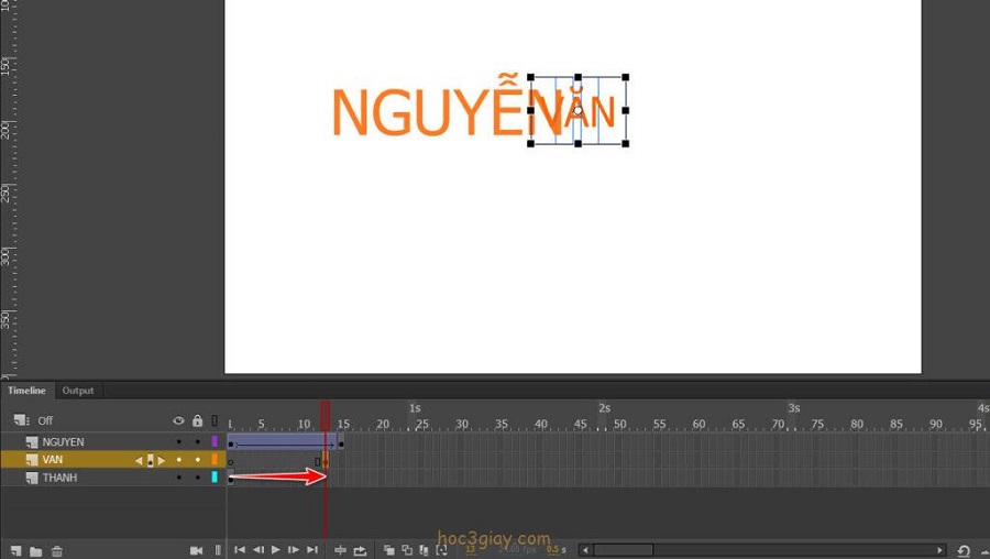 Bước 13: Kéo keyframe đầu tiên của layer Văn ra gần với keyframe cuối của layer Nguyễn. Sau đó bạn thực hiện các hành động tương tự như layer Nguyễn ở trên từ bước 7.