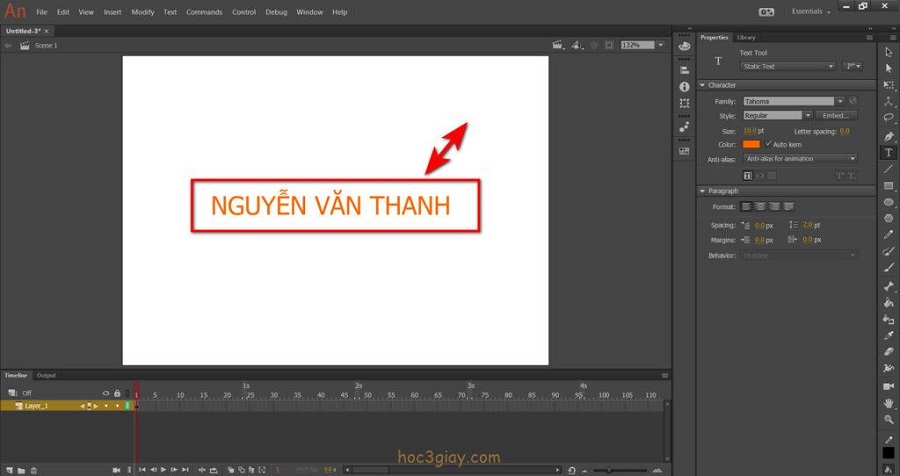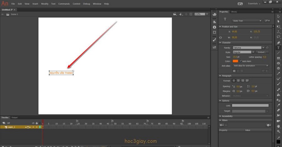 Bước 11: Click chuột trái vào keyframe ở đầu, sau đó chọn đối tượng Nguyễn ở trên vùng canvas.