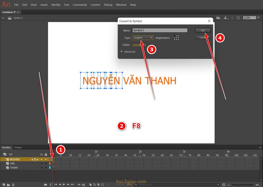 Bước 7: Bạn nhấn vào keyframe ở layer tên Nguyễn (1). Nhấn phím F8, hộp thoại Convert to Symbol sẽ xuất hiện, ở đây bạn thay đổi phần Type thành Graphic và rồi nhấn nút Ok để thiết lập.