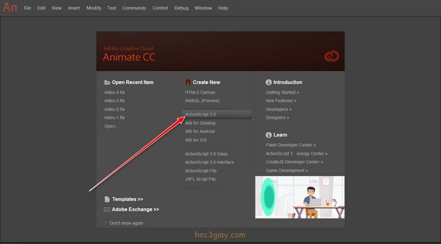 Bước 1: Click vào vị trí như ảnh bên dưới để tạo một ActionScript 3.0 mới.