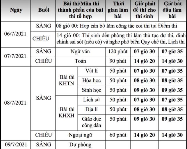 Lịch thi chi tiết được Bộ giáo dục công bố như sau: