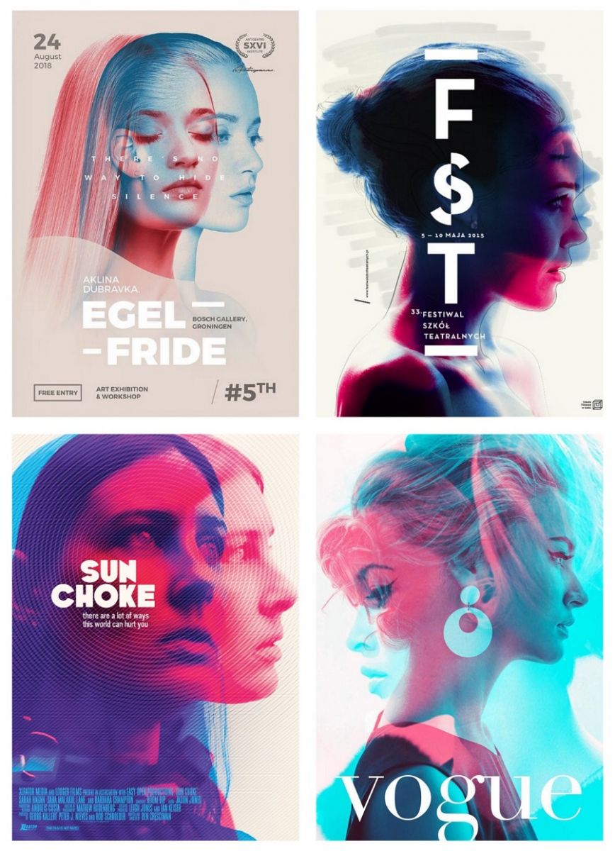 Chơi với các kênh màu để tạo ra hình ảnh đơn sắc / duotone, ảnh ba chiều và biến dạng hình ảnh cũng được xác định là xu hướng thiết kế bên cạnh độ phơi sáng kép. Sử dụng độ trong suốt để chồng lên nhiều độ phơi sáng của cùng một chủ thể cho phép các nhà thiết kế khám phá các biểu thức thay thế, xây dựng một câu chuyện nhiều cấp độ và tạo ra chuyển động.