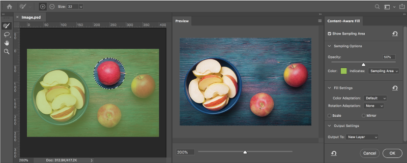 Công cụ content-aware fill đã có một không gian làm việc mới với nhiều tuỳ chọn giúp bạn có thể xóa các đối tượng tốt hơn. Để truy cập vào không gian làm việc này, hãy chọn một đối tượng mà bạn muốn xóa (sử dụng bất kỳ công cụ chọn nào), sau đó vào Edit> Content-Aware Fill.