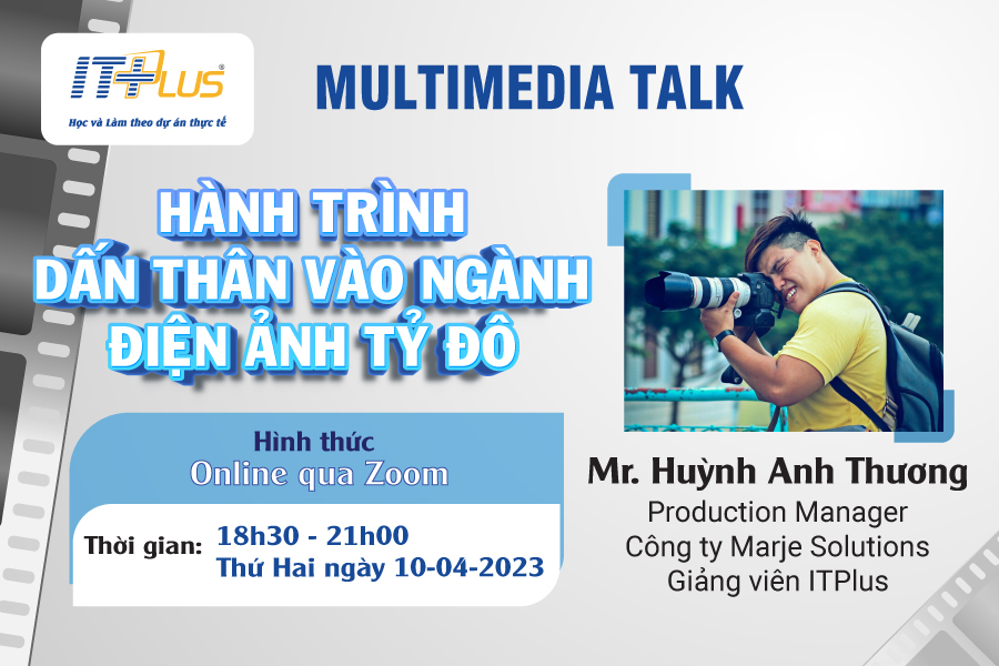 Nhằm cung cấp những thông tin chi tiết, toàn cảnh về lĩnh vực Quay, Dựng và Biên Tập Video, giới thiệu chương trình học nâng cao Khóa Dựng Phim Và Biên Tập Video, tìm hiểu chuyên sâu về lĩnh vực Multimedia Designer... Viện Công nghệ thông tin ITPlus trân trọng kết hợp cùng diễn giả: Mr. Huỳnh Anh Thương - Production Manager Marje Solutions - Giảng viên Quay Dựng ITPlus tổ chức buổi nói chuyện chuyên ngành “Multimedia Talk - Hành trình dấn thân vào ngành làm phim điện ảnh tỷ đô". Buổi chia sẻ sẽ được tổ chức Online phù hợp với các bạn đang tìm hiểu về ngành Editor, các bạn Editor muốn mở rộng kiến thức để phát triển sản phẩm… Chương trình diễn ra vào lúc: 18h30 - 21h00 Thứ Hai, ngày 10/04/2023 với sự góp mặt của: