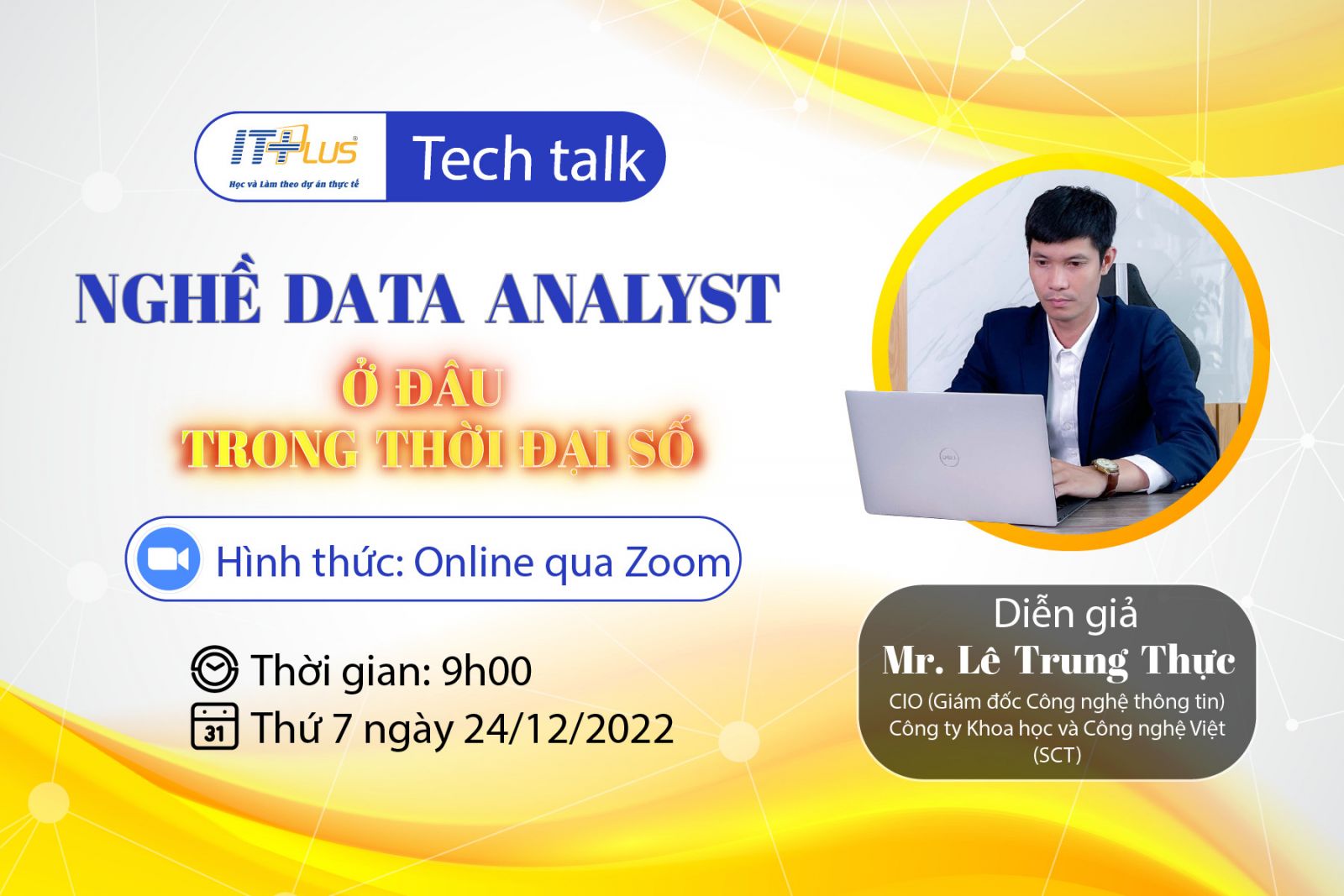 Với lượng thông tin ngày càng lớn trong thời đại công nghệ như hiện nay, việc đọc các báo cáo, khảo sát ở dạng dữ liệu thô (con số, văn bản) sẽ vô cùng phức tạp, tốn nhiều thời gian nhưng kém hiệu quả. Điều này buộc doanh nghiệp phải xử lý, sàng lọc và trực quan các dữ liệu thô thành những biểu đồ, bản đồ, đồ thị mới có được cái nhìn bao quát nhất và người làm công việc này được gọi là Data Analyst. Nắm bắt được nhu cầu này Viện Công nghệ thông tin ITPlus tổ chức chương trình Tech Talk (Online) "Nghề Data Analyst ở đâu trong thời đại số" vào lúc: 9h00 - 11h30 Sáng thứ Bảy ngày 24/12/2022 với sự góp mặt của: