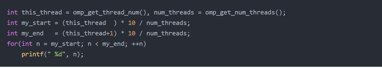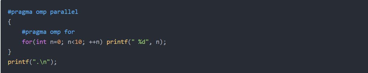 Chú ý rằng #pragma omp for chia các phần của vòng lặp cho các thread khác nhau trong team. Mỗi team là một nhóm các thread thực hiện chương trình. Khi chương trình bắt đầu, team bao gồm duy nhất một thành viên là thread chính đang chạy chương trình.