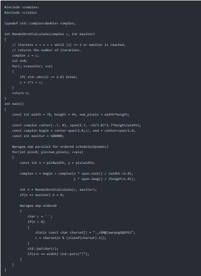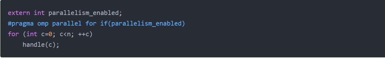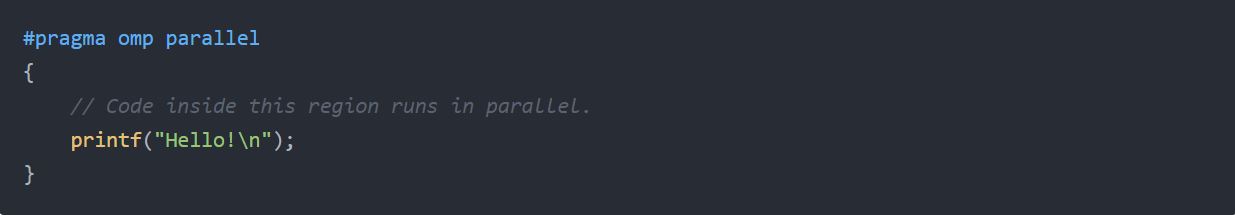 Đoạn code này tạo ra một nhóm threads, mỗi thread thực hiện cùng một đoạn code in ra màn hình dòng chữ “Hello”, số lần in ra màn bằng số thread được tạo ra. Ví dụ: Hệ thống dual-core sẽ in ra màn hình hai lần “Hello”. Tuy nhiên, nó có thể in ra màn hình đoạn chữ kiểu “HeHlellolo”, tùy vào từng hệ thống vì việc in ra màn hình được thực hiện song song. Sau dấu “}”, các threads được join lại thành một như khi chạy một chương trình thông thường.