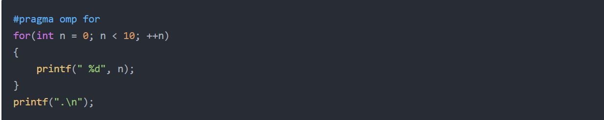 Chỉ dẫn for sẽ chia vòng lặp for mà mỗi thread trong nhóm thread hiện tại thực hiện một phần của vòng lặp