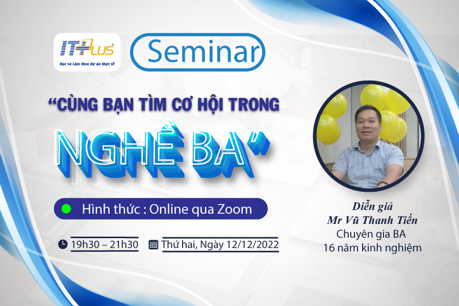 Nhằm tìm hiểu rõ hơn về Nghề BA (Business Analyst), mang đến một cái nhìn tổng quan về nghề, con đường để trở thành một BA chuyên nghiệp.... Viện Công nghệ thông tin ITPlus phối hợp cùng Công ty cổ phẩn iBPO tổ chức buổi hội thảo với chủ đề: "Cùng bạn đi tìm cơ hội trong Nghề BA" với sự góp mặt của diễn giả: