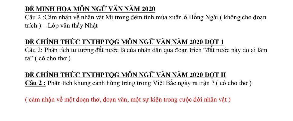 Đề thi minh họa và đề thi chính thức môn Văn năm 2020