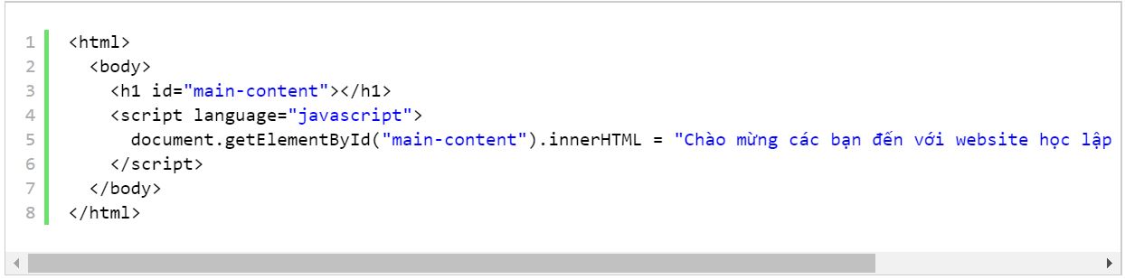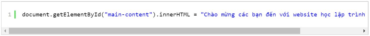 Đoạn code này có ý nghĩa rằng tìm thẻ có id=”main-content” và gán nội dung HTML bên trong của thẻ dòng chữ “ Chào mừng bạn đến với website học lập trình”.
