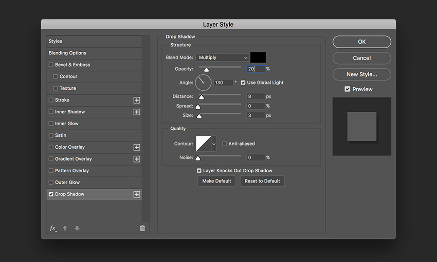 Để mở công cụ này, hãy vào Layer -> Effects > Drop Shadow. Nếu bạn đang sử dụng phiên bản Photoshop mới hơn, bạn có thể nhấp đúp layer cần thêm hiệu ứng để mở cửa sổ tùy chọn Layer Style.