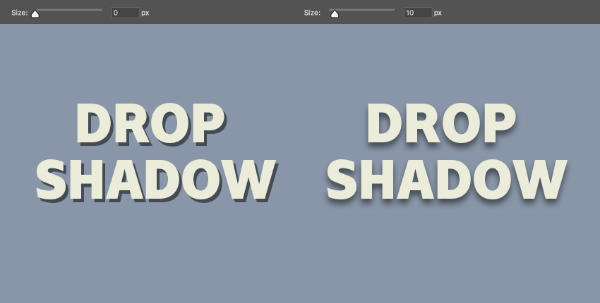 Size cho thấy sự mềm mại của bóng. Chúng ta có thể tạo ra một bóng rất sắc nét, cứng hoặc một bóng mềm, khuếch tán. Điều này sẽ ảnh hưởng lớn đến ảo ảnh của nguồn sáng. Văn bản ở phía bên trái được đặt thành 0. Điều này tạo ảo giác rằng nguồn sáng rất gần với văn bản. Văn bản bên phải được đặt thành 12, và bóng được khuếch tán và mềm mại hơn nhiều.