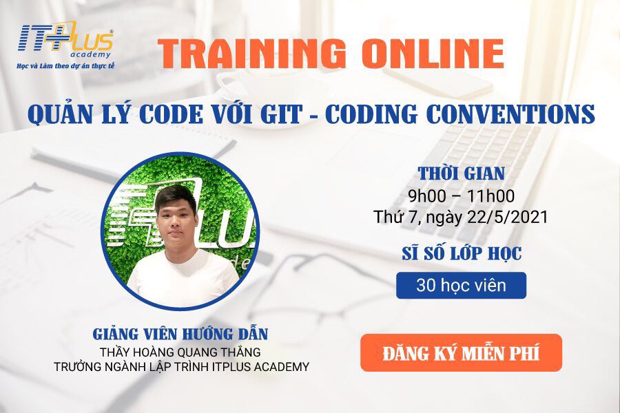 Nằm trong chuỗi chương trình “Dạy Lập Trình Online” miễn phí dành cho Cộng đồng sinh viên CNTT của ITPlus Academy, ngày 22/05/2021, Phòng Dự Án Lập Trình ITPlus Academy tổ chức buổi Training Online dành cho 30 bạn sinh viên với chủ đề: “Quản lý Code với Git – Coding Conventions”. Nội dung của buổi training:
