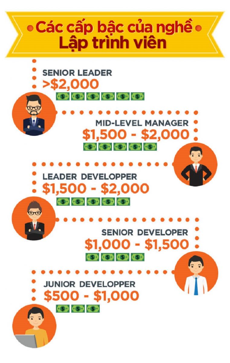- Junior Developer ($500 – $1000): Đây là trình độ dành cho môptj lập trình viên có thể viết được những ứng dụng cơ bản, thường có dưới 3 năm kinh nghiệm, hiểu biết tổng thể về cơ sở dữ liệu cũng như vòng đời các ứng dụng,