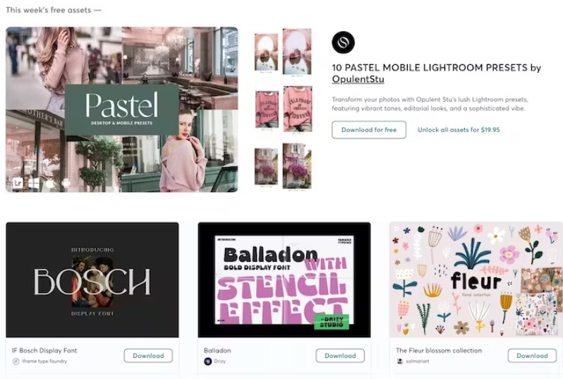 Mỗi tuần, Creative Market đều cung cấp 4 sản phẩm thiết kế miễn phí mà bất kỳ ai cũng có thể tải về? Thường thì, những sản phẩm miễn phí này bao gồm các phông chữ hoặc kiểu chữ đang nổi bật. Bạn có thể thường xuyên kiểm tra trang tải xuống miễn phí của họ hoặc đơn giản đăng ký nhận bản tin để nhận thông báo về những sản phẩm miễn phí, bao gồm cả phông chữ, được gửi trực tiếp vào hộp thư của bạn!
