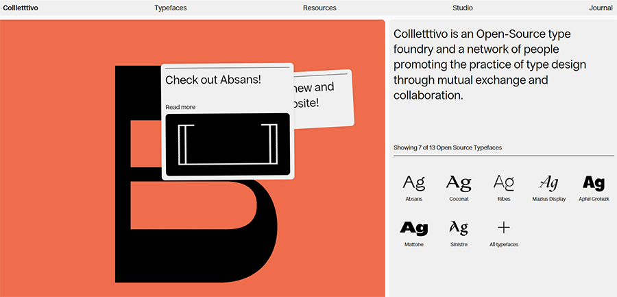 Collletttivo là một trang web tập trung vào thiết kế và phân phối các kiểu chữ nguồn mở miễn phí. Đội ngũ nhà thiết kế của họ đang ngày càng mở rộng và tham gia vào nhiều dự án liên quan đến kiểu chữ. Thường xuyên, họ cũng phát hành các kiểu chữ nguồn mở thông qua nền tảng của mình. Sứ mệnh của Collletttivo là xây dựng một mạng lưới nhà thiết kế đa dạng, thúc đẩy sự thách thức và cải thiện qua việc thực hành và chia sẻ kiến thức trong lĩnh vực thiết kế đồ họa và kiểu chữ, một lĩnh vực ngày càng cạnh tranh.