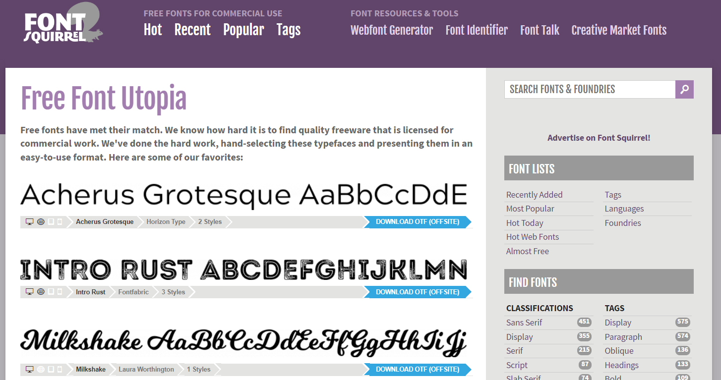 Font Squirrel, tự ví mình là "nguồn phông chữ miễn phí không giới hạn," là một nguồn tài nguyên xuất sắc nếu bạn đang tìm kiếm các kiểu chữ miễn phí phục vụ mục đích thương mại. Họ đã đảm nhận công việc nghiên cứu giấy phép và cẩn thận lựa chọn từng kiểu chữ hiển thị trên trang web của họ, giúp đơn giản hóa quá trình tìm kiếm cho bạn.