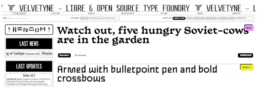 Velvetyne Type Foundry cung cấp hàng trăm kiểu chữ mã nguồn mở và miễn phí qua trang web của họ. Điều này đồng nghĩa với việc bạn có thể tự do sử dụng, chỉnh sửa và phân phối lại tất cả các phông chữ mà họ cung cấp (cho cả mục đích cá nhân và thương mại). Ngoài ra, nếu bạn có quan tâm đến việc tạo phông chữ của riêng mình, Velvetyne Type Foundry chấp nhận đệ trình phông chữ của bạn. Nếu được chấp nhận, phông chữ tùy chỉnh của bạn sẽ được giới thiệu và phân phối trên trang web của họ!