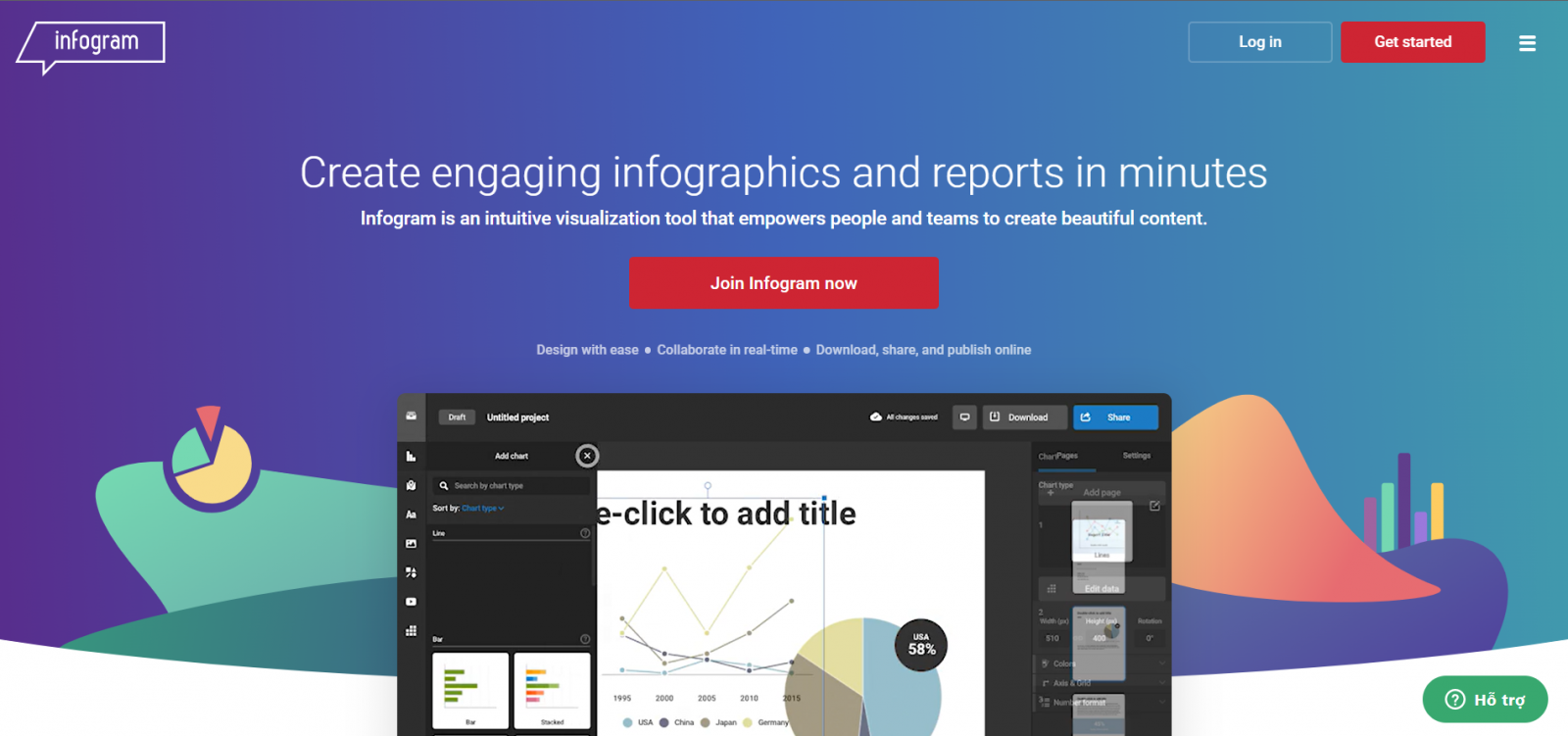 Infogram là ứng dụng tuyệt vời dành cho các bạn đang phải thiết kế infographic, biểu đồ và hình ảnh trực quan. Với Infogram, bạn có thể dễ dàng thiết kế: