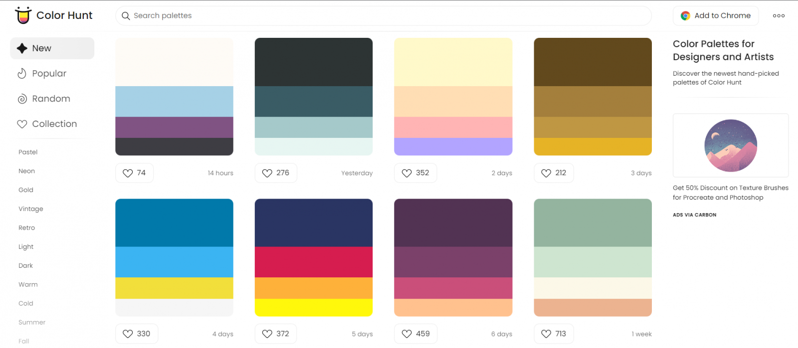 Color Hunt là nguồn bảng màu vô cùng đa dạng, được cập nhập hằng ngày. Vì vậy mà designers nên ghé thăm Color Hunt để tham khảo bảng màu ở đây nhé.