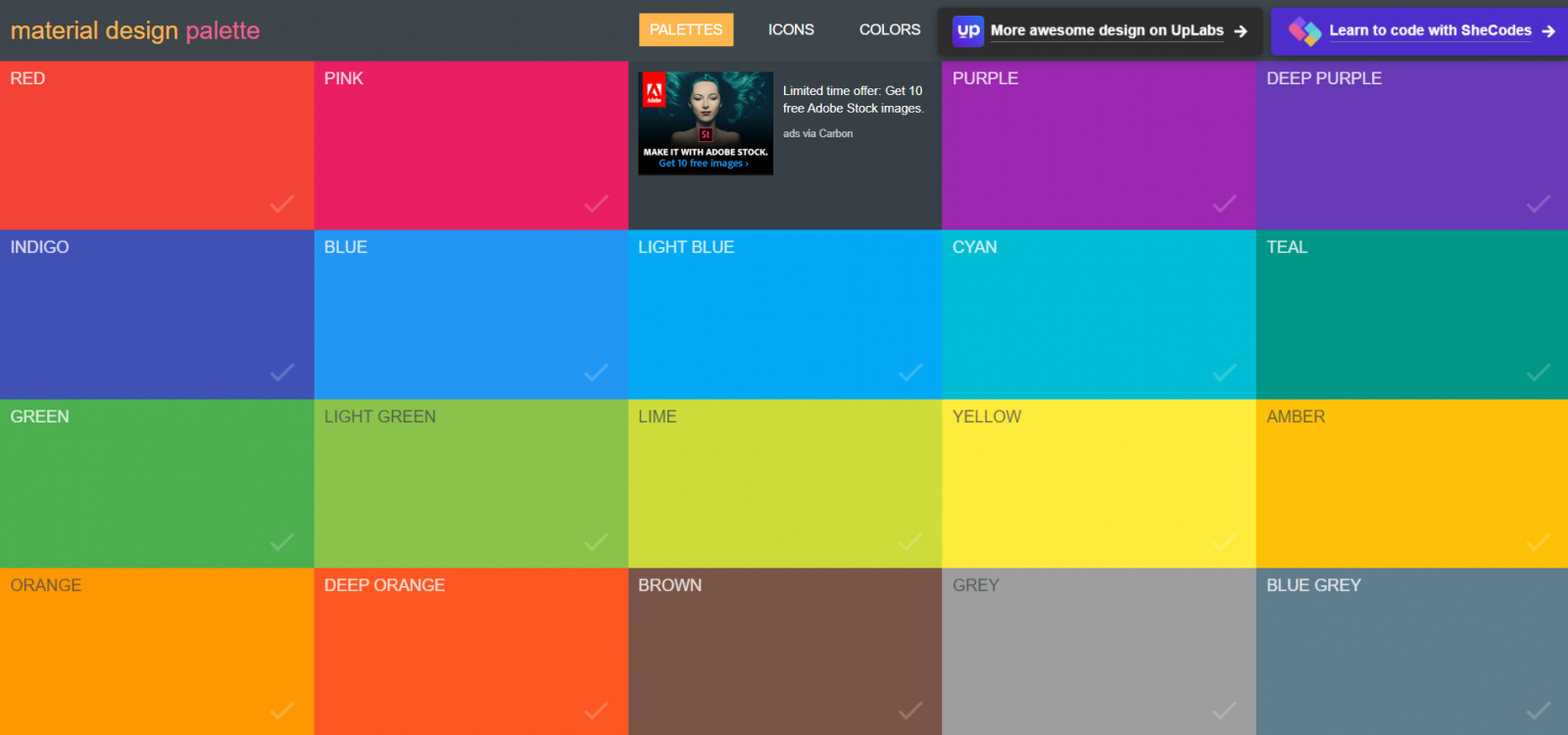 Ở đây có các bảng màu và các cách kết hợp màu phù hợp riêng cho các bạn thiết kế Material Design.
