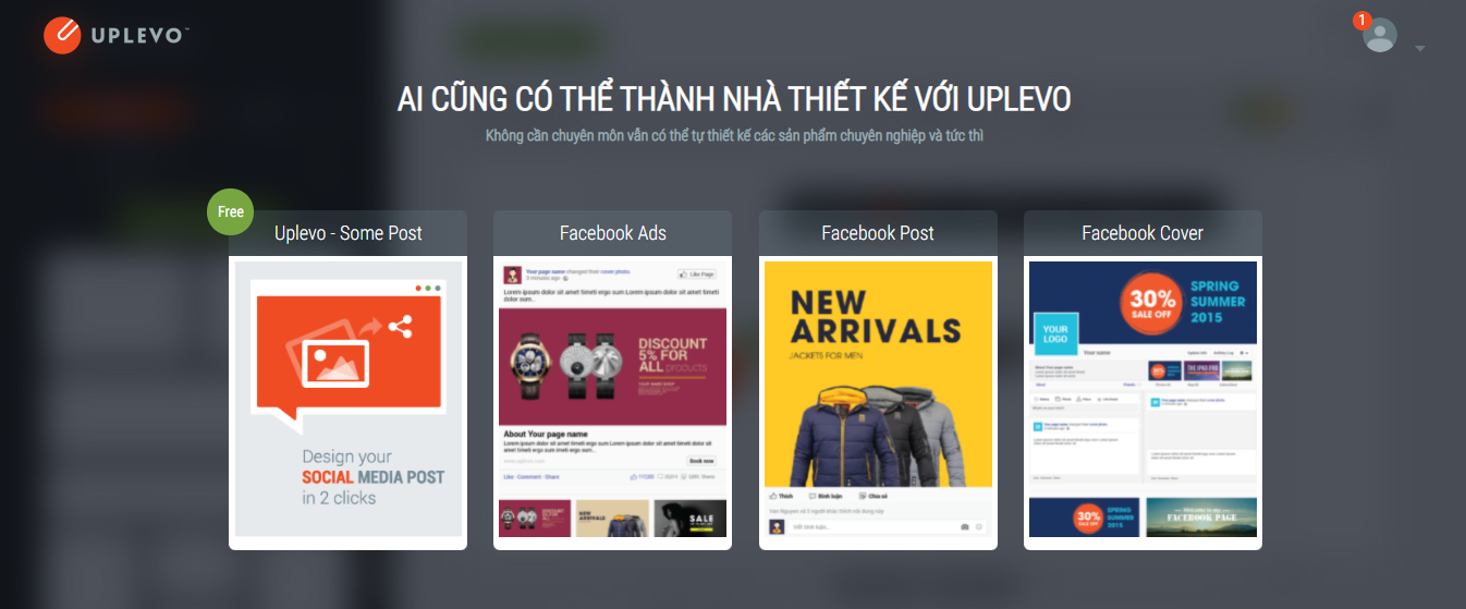 Phương châm của Uplevo là Ai cũng có thể trở thành nhà thiết kế với Uplevo. Đúng vậy, Uplevo thực sự là giải pháp thiết kế đối với tất cả mọi người. Cụ thể bạn chỉ cần chọn ý tưởng từ kho có sẵn, rồi thay ảnh và chữ theo ý đồ của mình là sẽ có ngay được thiết kế theo phong cách của riêng bạn nhé. Hơn nữa, Uplevo đặc biệt thuận tiện hơn với người Việt bởi website hỗ trợ font chữ tiếng Việt rất thuận tiện cho chúng ta khi thiết kế nhé.