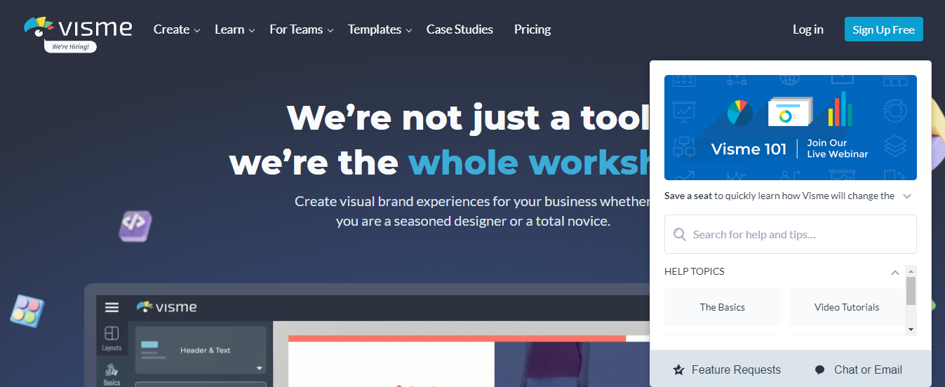 Visme được biết đến là công cụ thiết kế đa dang nhất về font chữ. Ưu điểm của Visme là nguồn tài nguyên font chữ đa dạng, các mẫu thiết kế cũng rất đa dạng, nhiều biểu tượng mới được cập nhập, kho thư viện ảnh cũng phong phú, khối số liệu chuyên nghiệp. Chính vì vậy, Visme là lựa chọn hoàn hảo cho các bạn muốn thiết kế infographic.