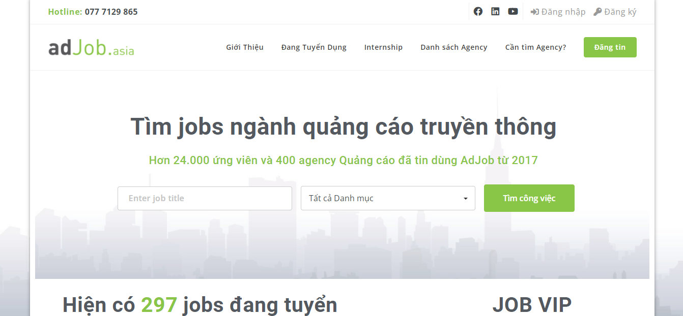 Nếu bạn theo ngành Quảng cáo và Truyền thông tại Việt Nam thì bạn không thể bỏ qua trang tuyển dụng Adjob Việt Nam, được ủy quyền bởi Advertising Vietnam. Trang web hoạt động từ năm 2014 và có mối quan hệ hợp tác với hơn 400 đại lý ở Việt Nam. Hiện nay đang có 297 jobs đang tuyển nhé.