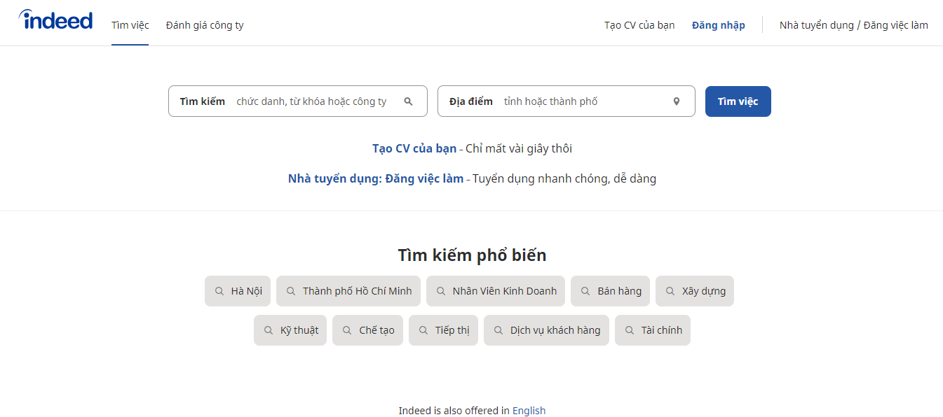Indeed được biết đến với các t tin tuyển dụng đa dạng ngành nghề, vị trí. Không chỉ có các tin tuyển dụng full time mà còn có các kiểu làm việc tự do, parttime, thực tập sinh dành cho sinh viên nhé. Nhờ vậy mà Indeed hiện đang vô cùng thành công tại thị trường tuyển dụng Việt Nam với hơn 250 triệu lượt người truy cập/ tháng.