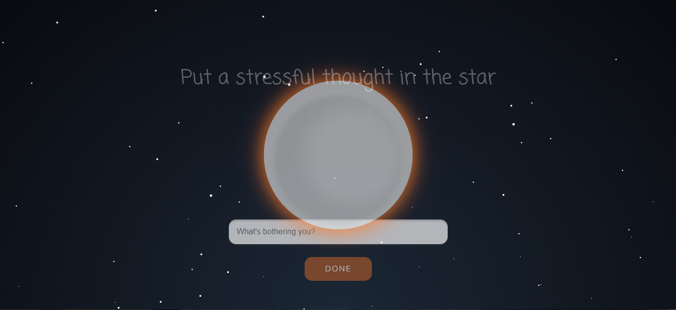 Ném suy nghĩ căng thẳng lên những vì sao (Put a stressful thought in the star) là cách tuyệt vời để giảm stress nhé. Ghi ra những cảm xúc làm bạn khó chịu giúp bạn tự nhận thức tốt hơn để điều chỉnh hành động của mình, từ đó thay đổi trạng thái cảm xúc nhé (What's bothering you?)