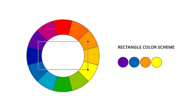 Đây có thể được xem là cách phối màu phức tạp nhất. Đó là việc bạn lựa chọn 2 cặp màu đối lập và đối xứng nhau tạo thành một hình chữ nhật. Cách phối màu này có thể đem đến những phá cách trong thiết kế, nhưng cũng đầy rủi ro khi việc kết hợp quá nhiều màu sắc đôi khi có thể gây rối mắt. Tuy nhiên, nếu bạn chăm chỉ và thành thạo trong việc sử dụng màu sắc thì đây chắc chắn sẽ là một cách phối màu siêu đỉnh đó.