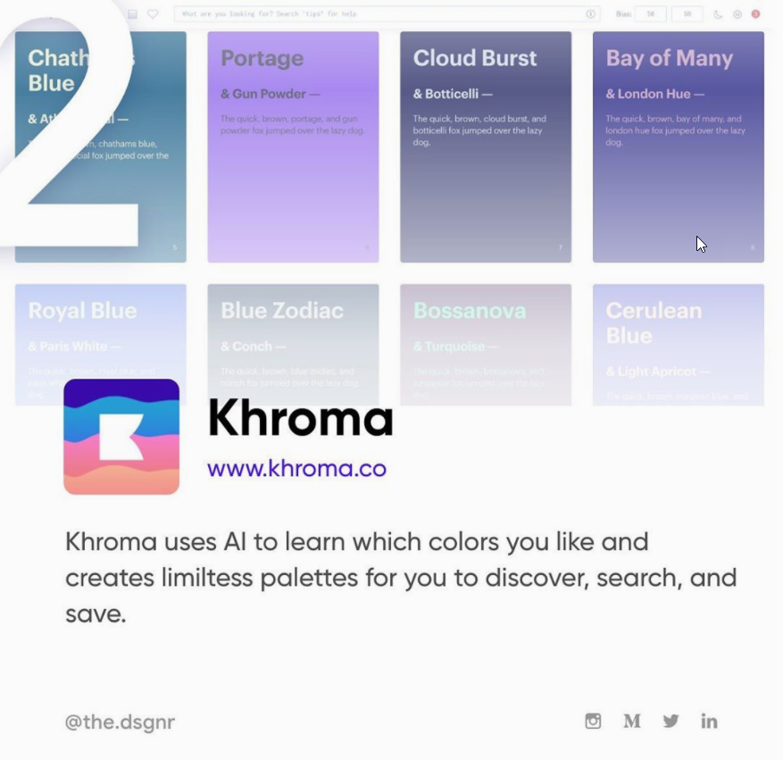 Công cụ Khroma sử dụng trí tuệ nhân tạo để thiết lập ra những dải màu cho riêng bạn. Chỉ cần click chuột và chọn ra 50 màu ưa thích nhất trên bảng màu có sẵn và nhấn “Get start”. Và thế là hệ thống đã tự động cập nhật, đồng thời gợi ý cho chúng ta hàng trăm màu để có thể sử dụng.