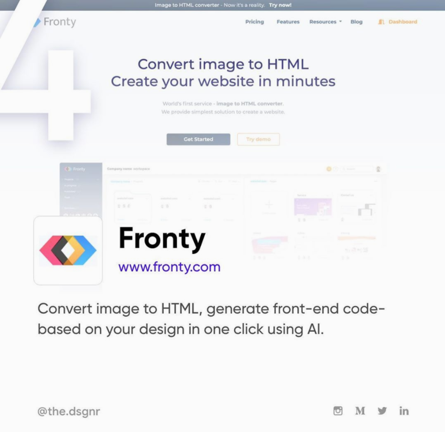 Sử dụng Fronty là một cách thông minh và tiện lợi đặc biệt với những nhà thiết kế web để chuyển hình ảnh sang HTML. Chỉ với 1 click, công cụ sử dụng trí tuệ nhân tạo này đã có thể tạo ra một giao diện người dùng dựa trên hình ảnh minh họa của bạn.