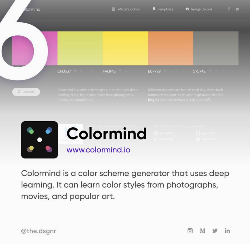 Colormind là một trình tạo bảng màu sử dụng trí tuệ nhân tạo chuyên sâu. Nó có thể nhận biết được các phong cách từ nhiếp ảnh, phim hay các tác phẩm nghệ thuật nói chung.