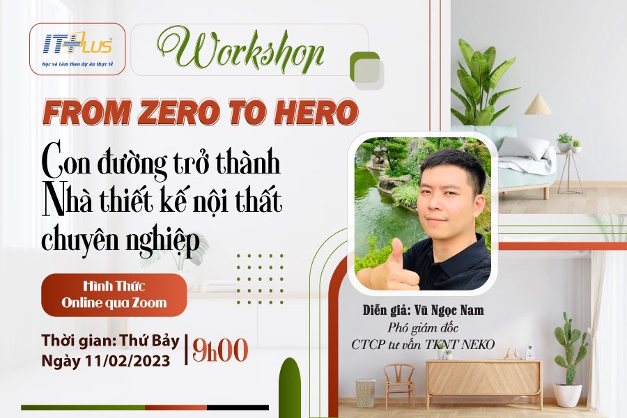 Là một đơn vị hàng đầu về đào tạo Thiết kế đồ họa và Truyền thông đa phương tiện, “Khóa học Thiết kế và Diễn họa nội thất” của Viện Công nghệ thông tin ITPlus hiện đang nhận được sự quan tâm của đông đảo các bạn sinh viên và người đam mê trong lĩnh vực Đồ họa và Thiết kế nội thất. Để cung cấp cái nhìn toàn diện về ngành “Thiết kế Nội thất” cũng như tư vấn chi tiết về chương trình học, Viện Công nghệ thông tin ITPlus tổ chức buổi Workshop (Online) với chủ đề “From Zero To Hero - Con Đường Trở Thành Nhà Thiết Kế Nội Thất Chuyên Nghiệp" vào lúc 09h00 - 11h30, Thứ Bảy, ngày 11/02/2023 sự góp mặt của: