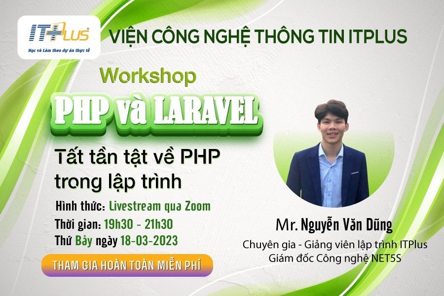 Nhằm giúp các bạn học sinh/ sinh viên, các bạn trẻ yêu thích lập trình, đặc biệt là lập trình website và ứng dụng bằng ngôn ngữ PHP có cái nhìn toàn diện về ngôn ngữ này và tổng quan về thị trường tuyển dụng PHP, Viện Công nghệ thông tin ITPlus tổ chức chương trình Workshop (Online) “PHP và Laravel - tất tần tật về PHP trong lập trình” vào lúc: 19h30 - 21h30 Chiều thứ Bảy ngày 18/03/2023 với sự góp mặt của: