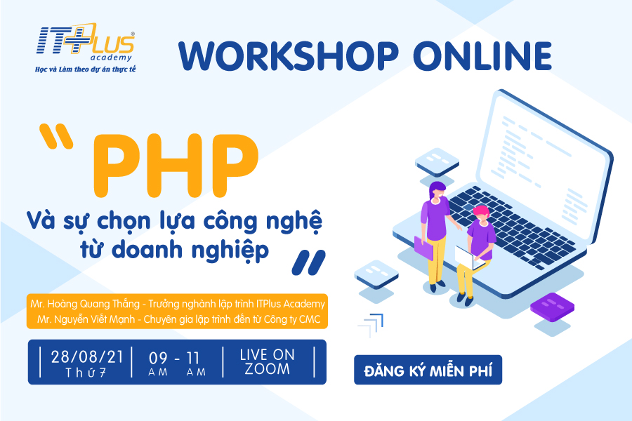 Nhằm giúp các bạn sinh viên yêu thích lập trình, đặc biệt là lập trình website và ứng dụng bằng ngôn ngữ PHP nắm bắt được các xu hướng hiện nay tại các doanh nghiệp thực tế, ITPlus Academy tổ chức chương trình Workshop Online "PHP và sự chọn lựa công nghệ từ doanh nghiệp" vào lúc: 9h00 - 11h00 Sáng thứ Bảy ngày 28/08/2021 với sự góp mặt của các khách mời: