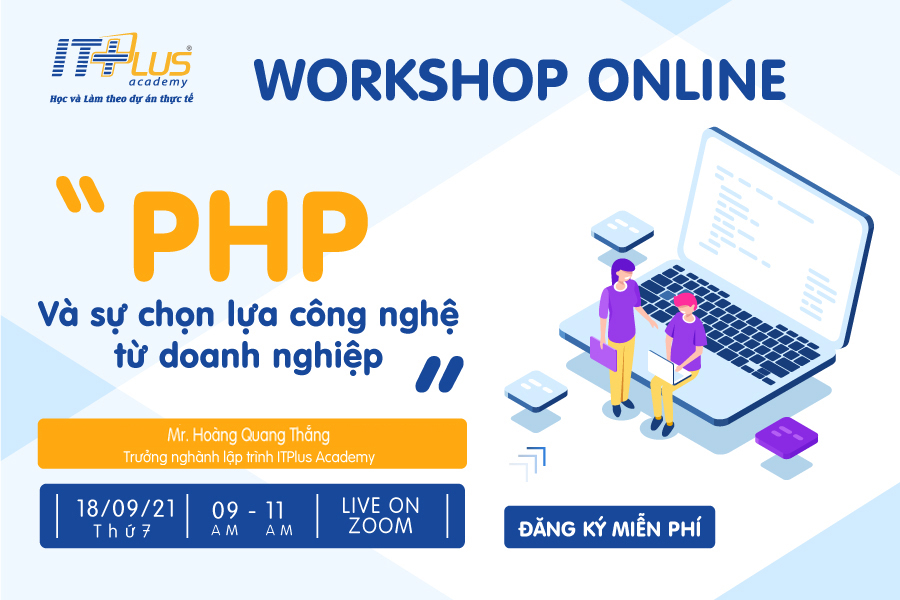 Nhằm giúp các bạn sinh viên yêu thích lập trình, đặc biệt là lập trình website và ứng dụng bằng ngôn ngữ PHP nắm bắt được các xu hướng hiện nay tại các doanh nghiệp thực tế, ITPlus Academy tổ chức chương trình Workshop Online "PHP và sự chọn lựa công nghệ từ doanh nghiệp" vào lúc: 9h00 - 11h00 Sáng thứ Bảy ngày 18/09/2021 với sự góp mặt của các khách mời: